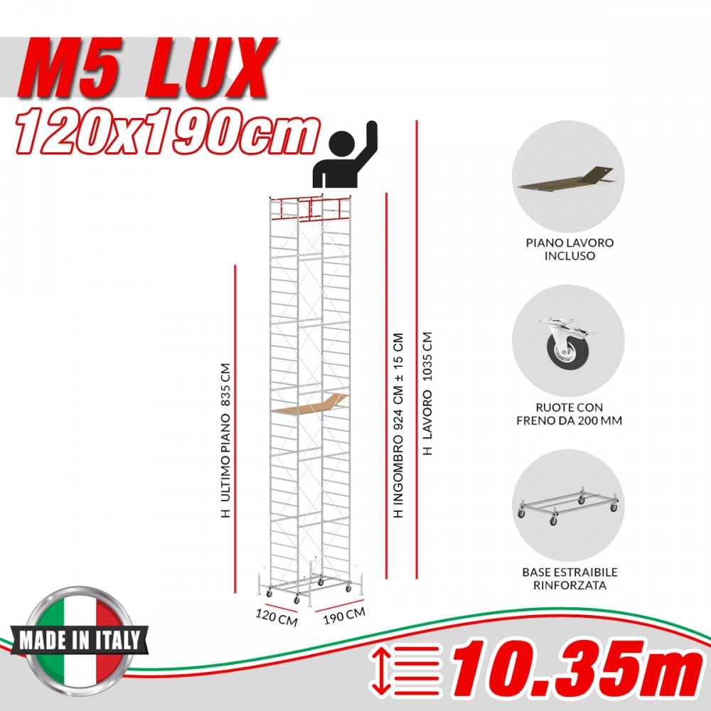 Il trabattello M5 LUX è adatto per usi professionali, edilizia, manutenzioni civili ed industriali, settore elettrico. Facile da montare e smontare, è dotato di una base estraibile rinforzata in quattro pezzi ed è corredato di ruote da diametro 200 mm. Il piano di lavoro in legno è raggiungibile dall'interno attraverso una botola di passaggio. I piani di lavoro sono collegabili ogni 30 cm. I tiranti diagonali sono facilmente applicabili su appositi bussolotti alettati senza alcun uso di viti e bulloni. Il trabattello è zincato elettroliticamente e completo di certificato di conformità.