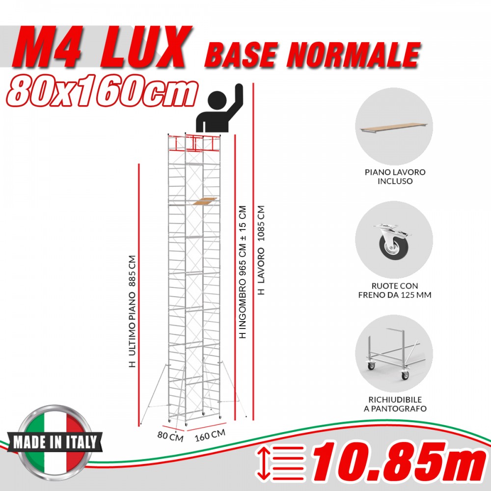 Il trabattello M4 LUX con base normale è adatto per usi professionali, edilizia, manutenzioni civili ed industriali, settore elettrico. Facile da montare e smontare, è corredato di ruote da diametro 125 mm. Il piano di lavoro in legno è raggiungibile dall'interno attraverso una botola di passaggio. I piani di lavoro sono collegabili ogni 30 cm. I tiranti diagonali sono facilmente applicabili su appositi bussolotti alettati senza alcun uso di viti e bulloni. Il trabattello è zincato elettroliticamente e completo di certificato di conformità.