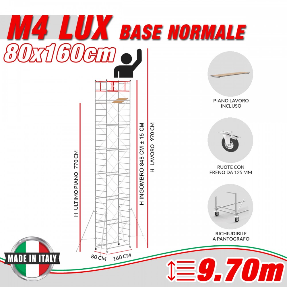 Il trabattello M4 LUX con base normale è adatto per usi professionali, edilizia, manutenzioni civili ed industriali, settore elettrico. Facile da montare e smontare, è corredato di ruote da diametro 125 mm. Il piano di lavoro in legno è raggiungibile dall'interno attraverso una botola di passaggio. I piani di lavoro sono collegabili ogni 30 cm. I tiranti diagonali sono facilmente applicabili su appositi bussolotti alettati senza alcun uso di viti e bulloni. Il trabattello è zincato elettroliticamente e completo di certificato di conformità.
